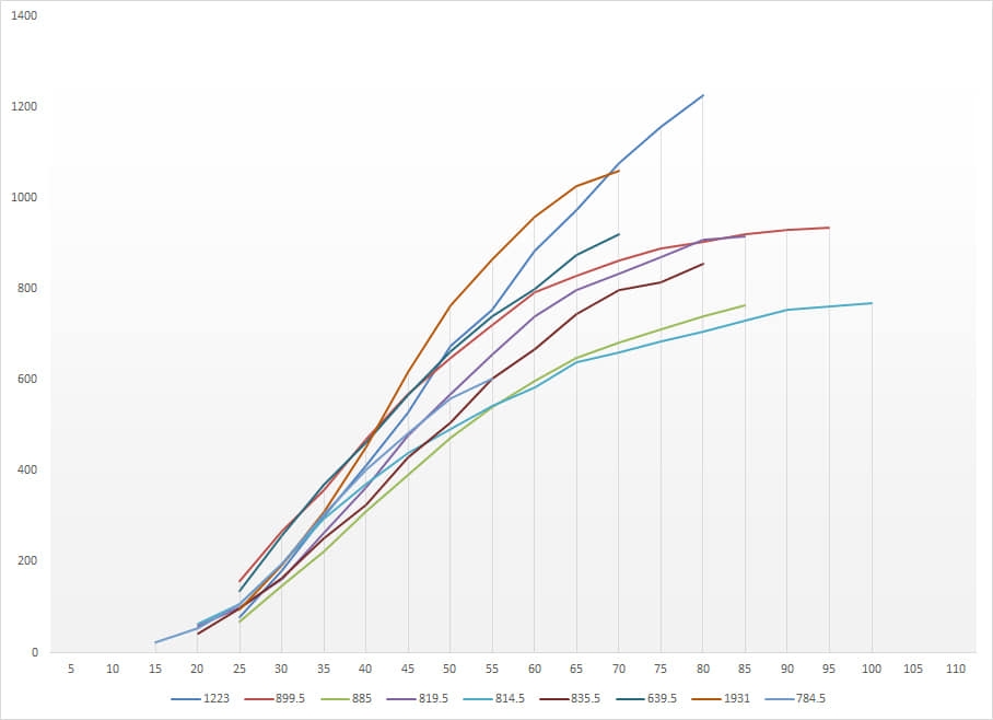 Real disappointing week for the weights. It looks like all this cold weather finally caught up to them. You can see from this graph of all of my biggest pumpkins that it has now fallen behind my personal best. It needs to average about 9 pounds a day to get to 1223 by September 21st. Probably not going to make it. Its mother went 5% heavy so if I can get it to an estimate of around 1175 at least it will have a shot. We are supposed to have a couple of days near 80 later this week so I am hoping for one more little bump in weight.