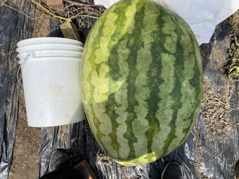 This fat Carolina Cross had a 186 OTT measurement. Unfortunately, it to had started to rot. So my three biggest watermelons this year, all rotted, this one was solid a four or five lober. Too bad. This one was grown on the 160 Houston plant. I grew two melons on the plant. The other one was still good and I brought it to the Bethlehem fair. It was a long one and it weighed 178 pounds. I will post some pictures in a following entry.