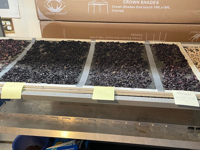 Purple finger season after seeding the tall sunflowers. Seeds are drying for next year. We will plant these as they grew straight and supported themselves after our 7 foot 2x2's. Plants were from 14'5� to 15'11�.