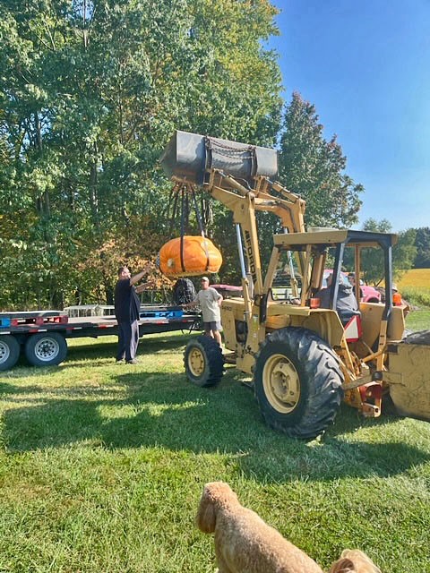 This year - not growing for competition, but for nice sized, beautiful pumpkins, to be used for commercial display - I grew 10 pumpkins. Here is Papa Rea on his old Ford tractor. He LOVES picking up pumpkins!