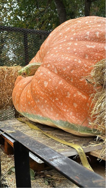 Hard to tell in this picture but this pumpkin was very close to tipping over once we get her on the pallet. Had to quickly hold her up with both hands. When she was growing I had to force a ton of sand to prevent her from tipping over but once that was gone because of harvest she wanted to tip right over!