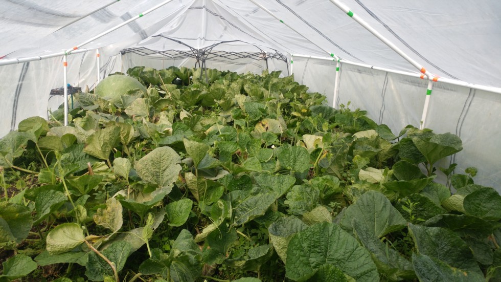 Although I've never done it before, I MIGHT set up a small 18 x 30 ft (540 sqft) greenhouse for the 2501 x 2222 Giant Pumpkin. which is currently at 105 DAP and is growing on a 1300 sq ft plant. As you can see below, I always set a hoop house up for my Bushel Gourds in September to carry them to mid October. The BG plants and fruit thrive in the hoophouse warmth.