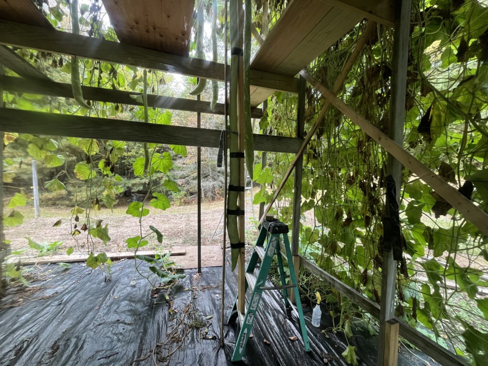 When I cut a long gourd down I always tape it to a pice of wood. When you have it tightly fastened to the wood, then you can cut the stem of the fruit. We've been pretty dry here and this Saturday we had about an inch of rain and I started seeing some weeping from the long gourd so I decided to take it down before I would have any problems with it . In the past, I've had lost long gourds after they have stop growing from splitting after big rain storms so better save them sorry.