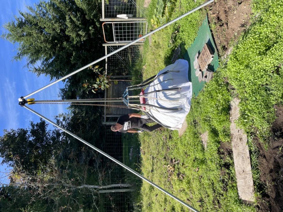 Andrea took this photo of me and at first, I didn't like it. Then, as I looked better at it, I realized it is such a great example of our pumpkin community coming together and it reminded me of the following. I thank the late Craig Sandvik (islandorange) for giving me his lifting ring when he stopped growing. I thank the late Steve Handy for making me the tripod head/leg holder and I thank Ron Barker for not only introducing me to Steve, but actually picking up the lifting ring and bringing it with him to Vancouver Island from Washington State when he was attending an Island Weighoff. Then a great tip from Eric Gerry (pumpkinpal) who had a great diary entry that showed the water pipe insulation he suggested using on the lifting straps to protect the pumpkin during lifting, thanks Eric.