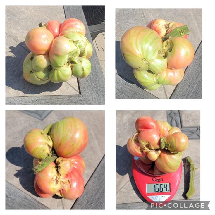 Here's the resultant fruit from that 10+ mega bloom supported by a 1.25 inch wide ribbon stem. Now the 1.66 Greene UOW seed tomato. This was a meticulously closed pollination from the 9.06 Brown.
