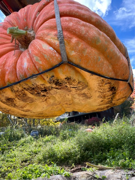 Ok a few more pumpkins to go to clean out the home patch and end the 2024 season. My 421 has been measuring neck and neck with my 2198 Haist all year. She is a long low rider model with a nice orange color. Our event of choice will be the Grahamsville New York Giant Pumpkin Party. It is a non GPC event but a nice local fall festival that we enjoy going to. Another call to my tractor guy Craig and we are picking pumpkins again. Bottom is good.