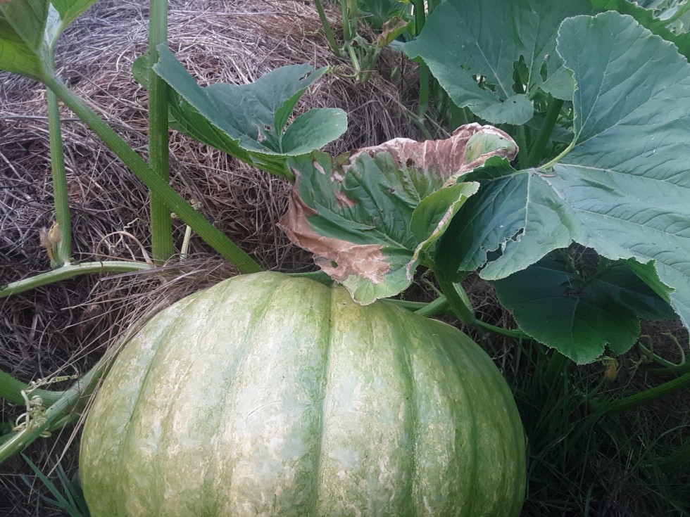 Its a little bit hard to tell but this squash has a recessive pumpkin gene clamoring to take over. Its really difficult to make a good selection early on because up until DAP 20 this was just as green as another one nearby. Then it turned light green, which is fine. But now there's all this recessive pumpkin color stuff coming through. Its hard to see in a photo, but seeing it in person you could tell it has recessive pumpkin genes.