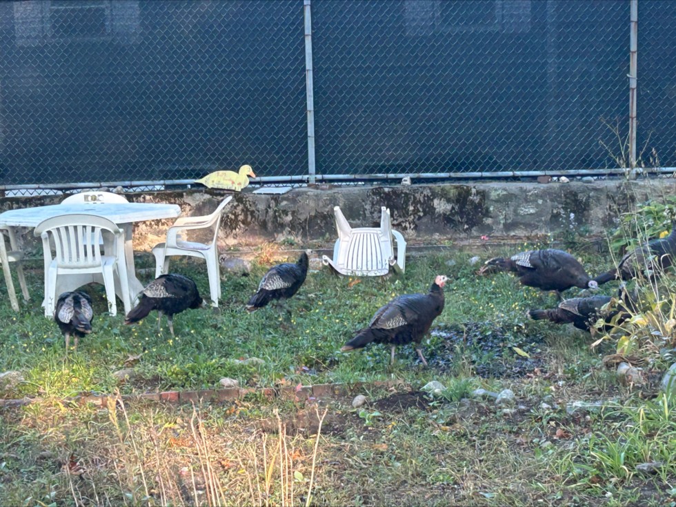 I went down to water this morning and these turkeys were tearing up the remaining plants. I unsuccessfully tried to round them up and walk them out of the front gate. Fortunately one flew out and the others quickly followed and they landed on nearby roof tops. Even in the city limits here turkeys are very common. A few years ago I saw one down on State Street near the Custom House.