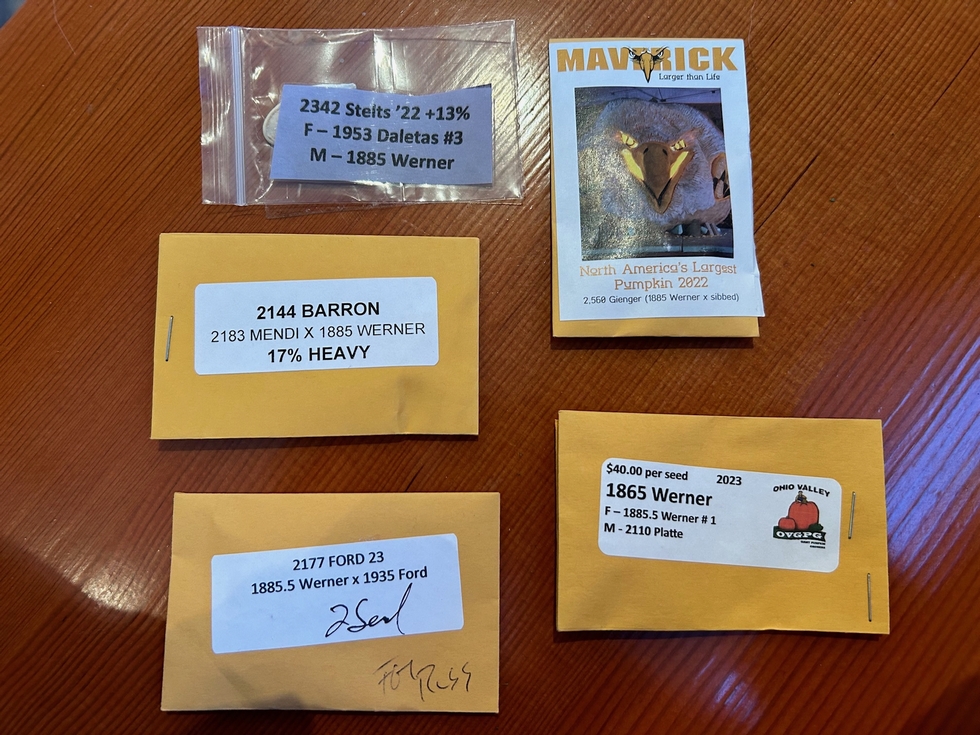 Big & heavy is what it is going to take from here on out. Up until last year you could get away with just being big (480+ OTT). Now the harsh reality is that you have to be crazy-heavy too�if you want to be competitive. One of my goals this year was to grow pumpkins with really big OTT measurements. I feel that I achieved that goal. Unfortunately my expectation that super-heavy would just happen because of my growing practices turned out to be �pumpkin-grower fantasy.� I love 1885 Werner crosses. I also like the idea of crossing the 2560 Gienger (1885 Werner x sib) into these proven super-heavy monster-makers. Fortunately I acquired these seeds before their cost goes through the roof�and that will happen very soon.