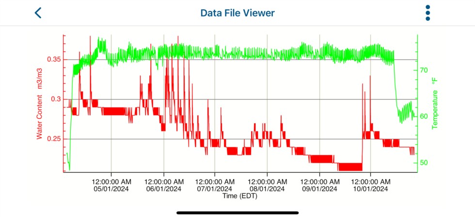 Data log from one of my hobo onset units for the 2024 growing season. This unit was placed at the edge of my heating cable system that I have set on a thermostat control. It can be seen by the green temp chart line where the heat was plugged in at early spring and unplugged at harvest. Soil temps were successfully held between 72-75deg for the duration of the season. The red line is moisture percentage. A wet spring was noted early with little to no precipitation starting in June and lasting until late September. Of course I watered. In fact, I watered more than I have ever watered before in a season. I have the water bills to prove it! Some days giving upwards of 300gal per 1000sqft. Natural drought is just a tough foe to fight with a water hose. Rain did come with Helene in late September spiking my beyond saturation levels to 31-32% but it appears that my original field holding capacity had dropped from it's early season 28-29% levels to 25% in late season. The only way I can rationalize this decrease is from natural soil compaction.