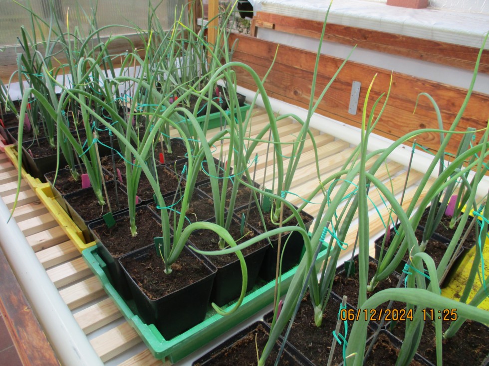 Onion plants potted on and moved from 24hr area into my little heated Greenhouse. Lights now on 10hrs. during the day.