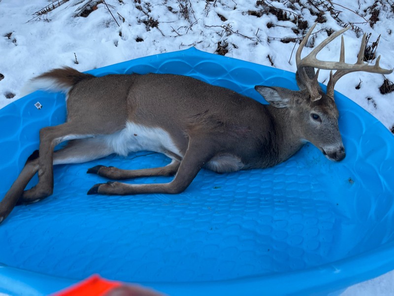 Who knew you can get a deer out over the snow in a swimming pool. ??. Good thinking Val. Who needed me to help drag it out. Atta girl Val !