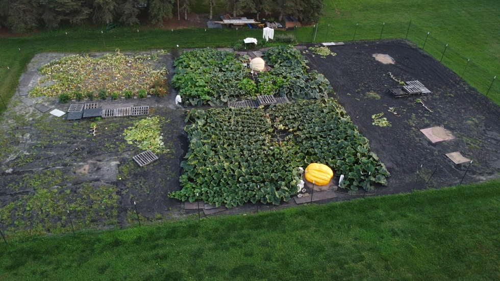 September 12th...we are sitting on a 2501 Bernstrom fruit top middle that stopped growing nearly a month ago but no signs of rot. We did have a major heat and humidity event for a few days around the time it quit so must have prematured. Top left is a patch of office pumpkins; jack b little and baby boos. 2222 Gienger baby fruit continues to grow well as she was pollinated after the majority of the heavy rains occurred.