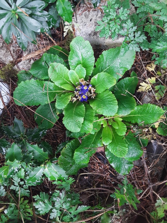Apparently this primrose already bloomed and I missed it. My bad, I wasnt out looking for any flowers in December. This plant has been in this spot for 10+ years! In the right spot, they can be VERY perennial. A good spot is somewhere that gets low angle sun in the winter and has little other competition. This one is in the heavy needle-fall area under a large conifer. The spruce needles are a natural slug repellent, otherwise it would have been destroyed by slugs long ago.