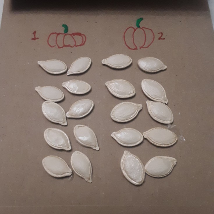 So that was interesting. But then this year I had a field pumpkin where two were set at the same time so that would eliminate most of the temperature difference (unless one got more sun than the other) and most of the nutritional difference. But I still suspected the seed sizes between the two pumpkins might be different. Why would the seed sizes be different? First, here are the seeds from two field pumpkins set at the same time on the same plant. Can you see that that ones on the right are larger? (I will theorize why in the next diary entry).