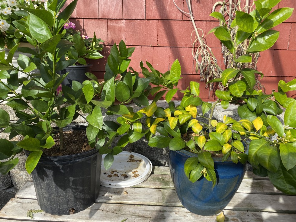 Two dwarf citrus trees I bought at Home Depot this past summer for 4.95 I couldn't pass it up. I brought them home and repotted them. One of them Looks like it's showing a nutrient deficiency. My first guess was that it's iron. so I bought some iron plus Micros. I no longer think it is iron as iron deficiency shows up first in the new growth. This appears to be on the older growth. Still I almost guarantee that the iron plus micronutrients will fix it. Any citrus experts out there? dale from Australia what do you think?