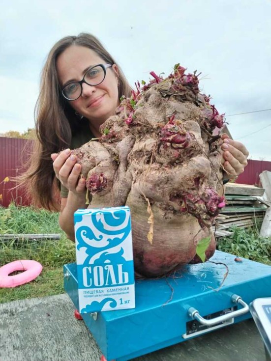 The heaviest beetroot weighing 16,15kg (35.6lbs)was grown by Olga Dogadaeva (Russia). The beetroot was grown from Kevin Fortey seeds (the genetic line of 24kg(52.9lbs) beetroot) 5 October 2024