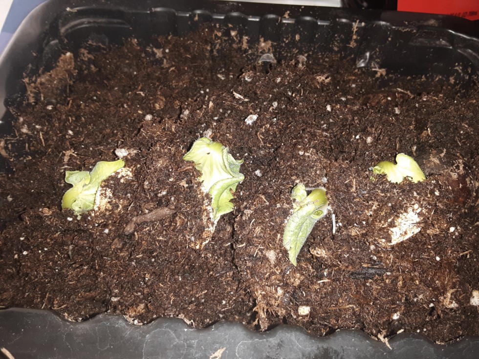 The (not) perfect germination of the 1677 Clayton's. It would have been perfect except I can see one tore off its own cotyledon. The root lengths were identical so prior to the cotyledon accident, all were of very similar strength. They would have been four perfect test subjects & now down to three. Oh well.