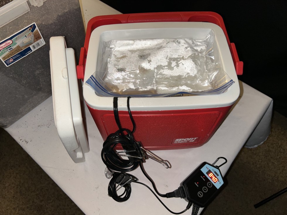 My homemade germination chamber. It is warmed by a mini heating mat in the bottom of the cooler and the seeds sit on the perforated cardboard shelf. There is a thermostat system that keeps the temp at 86 degrees F. It works well but I'm having issues with mold forming even when I soak in 1% peroxide. Thoughts?