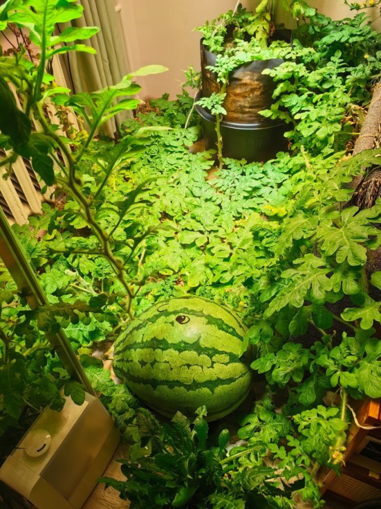 The giant homemade watermelon already weighs 58 pounds. I put him on the scales to monitor his progress.