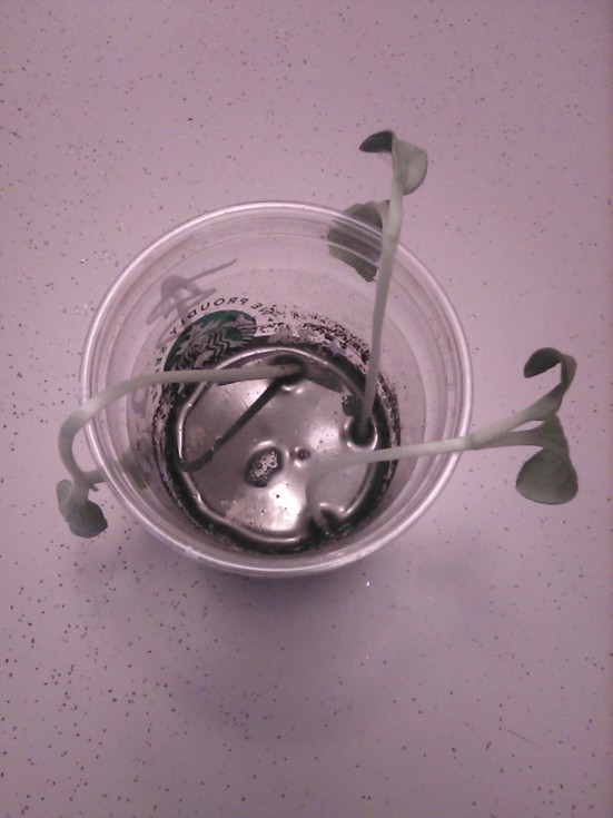 The Man Vitamin was a little too manly, lol, and I wish they'd have that effect on me, lol. Well, NO, since these plants are at Death's door and yet, now, as of the 5th, one of them is still kicking but the other two are in dire straits; They are none of them able to be pulled from their root systems, usually a final sign of The End, SO I added about 3 ounces, a VERY loose guess, of H2O and that was when the alivest-looking one started...or continued...to 'perk up' - It could be MY own Placebo Effect - My optimism that they will recover. Thankfully, I have another experiment in the works. Stay tuned! ..........Ummm, Hello?...lo...?lo...?lo...?lol......eg
