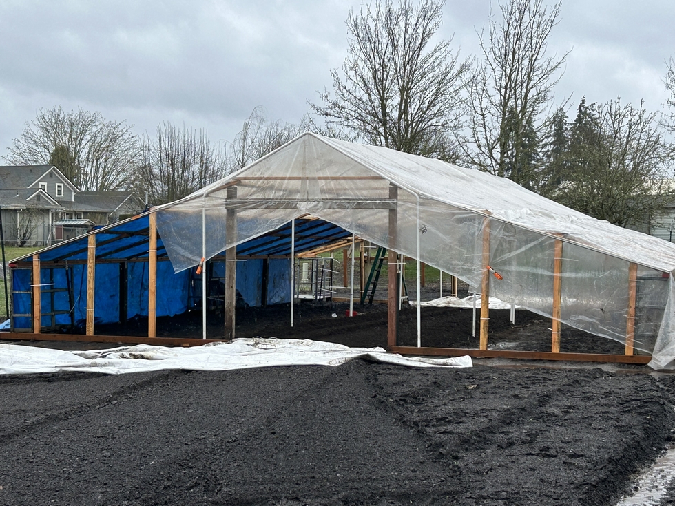 This morning I started putting on the rest of the plastic. It wasn't supposed to start raining until noon.but it started raining shortly after I began. I got plastic on one side & put up a couple tarps on the other side while getting poured on. And yes, it does leak some, but it isn't really too bad. Three hours & a half-inch of rain later I was finished.