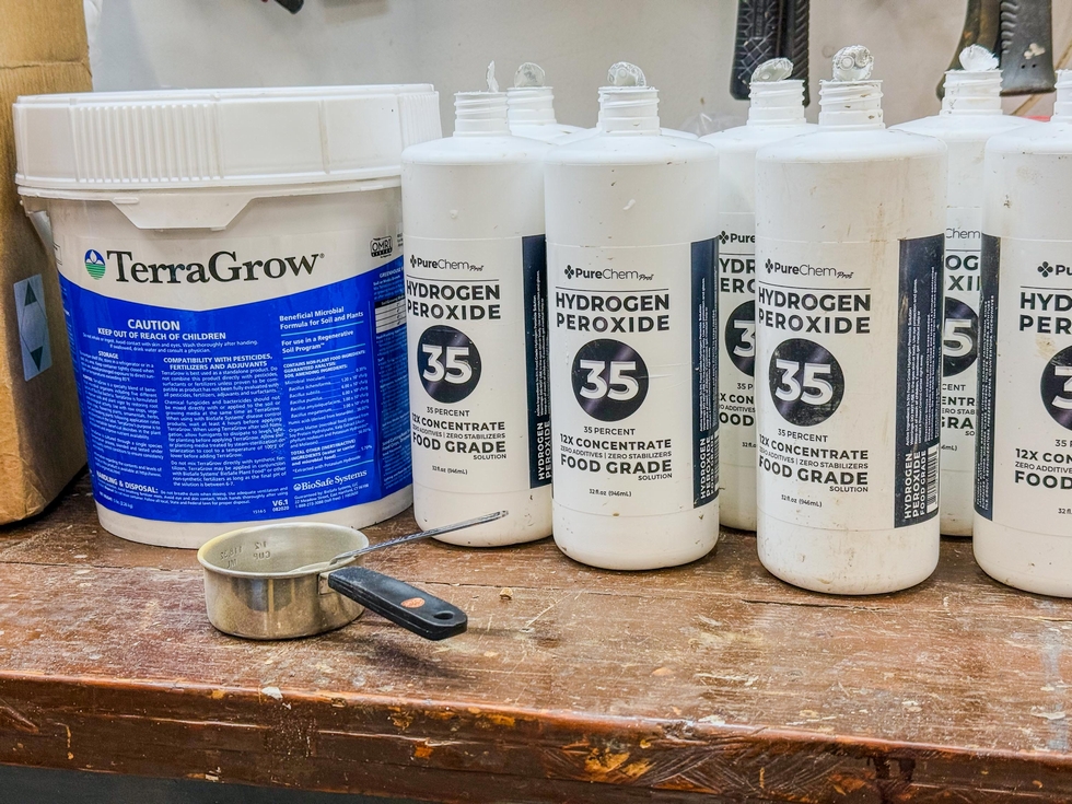 In an attempt to reduce disease in the soil I used food grade peroxide diluted to 3 % to saturate the patch. The next day I tilled in Terrogrow to help replace the beneficial bacteria
