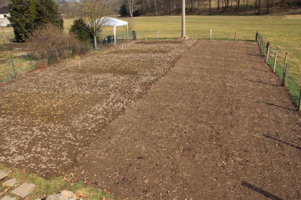 Patch today :) Now the weeds are buried, and I have piled up some soil at the plant spots. Right after finishing that part of work, we've got some rain (and some snow). Now the soil can settle for the next couple of days, and then (end of March) the plant sites will be covered with clear plastic sheets...the sun needs to warm up the soil.