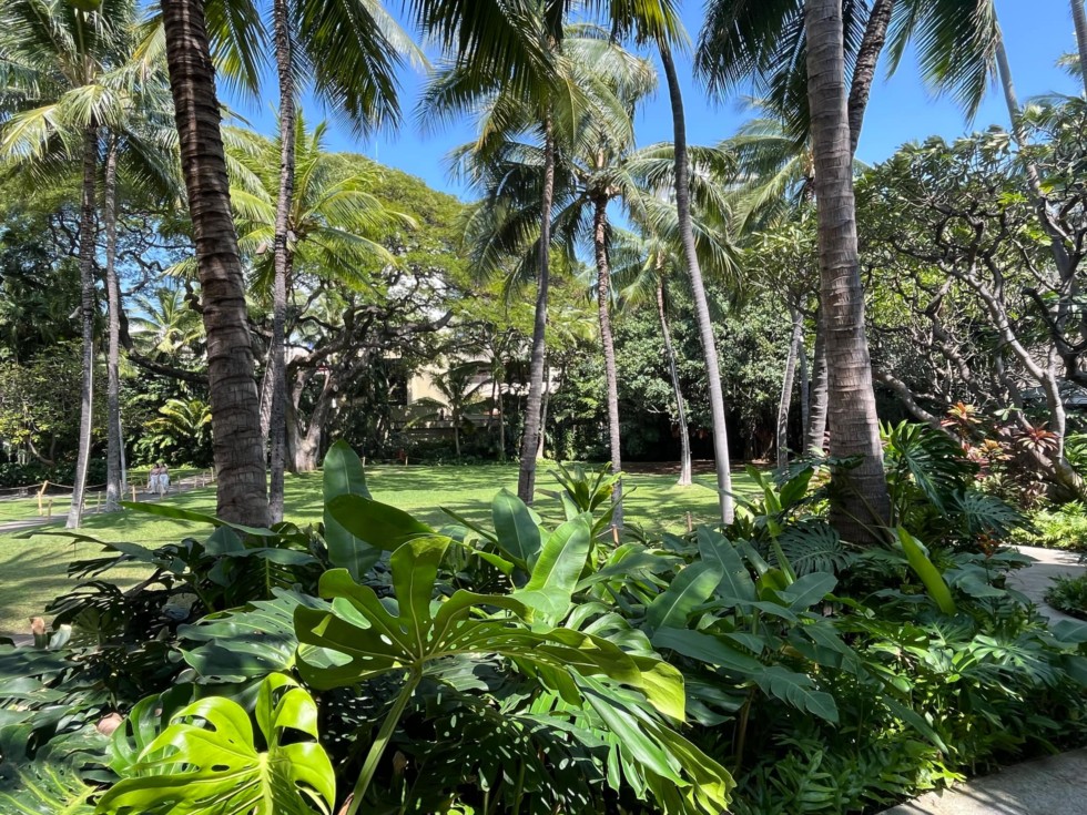 Beautiful gardens at The Royal Hawaiian in Waikiki Beach, Honolulu. Despite being in one of the busiest parts of the city, its very quiet here.