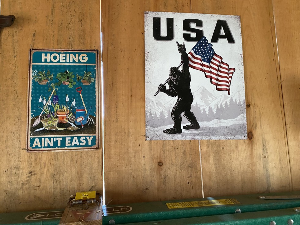 This is in my barn. My daughter saw the "Hoeing ain't easy" and Bought it for me. My son got me the Bigfoot one on his trip out to Washington last summer.