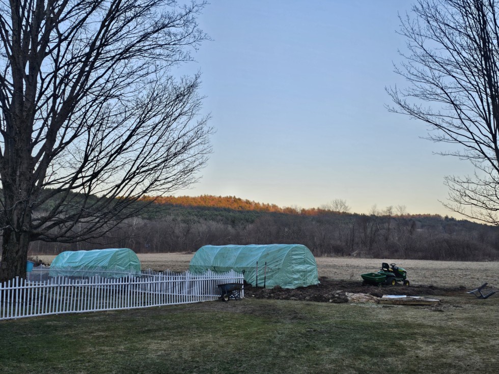 Both 20 x 10 greenhouses are up, planting holes are dug and soil is warming up via heating cables