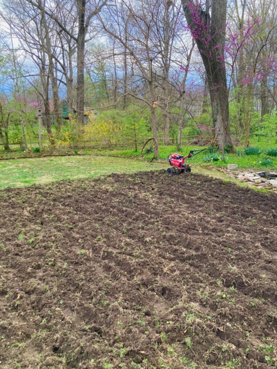 Perfect evening to till. Redbuds watching the progress and Spring Peepers calling in the background.