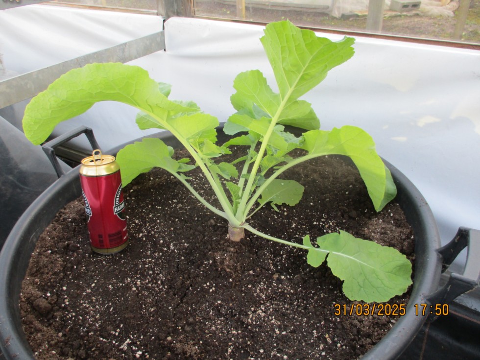 We now have hot sunny days but frosts at night, difficult conditions for veg. plants in pots inside. Planted out the Swede, 2 in 130 litre pots inside my enclosed frame and 2 into the ground in the netted tunnel covered by large cloches.