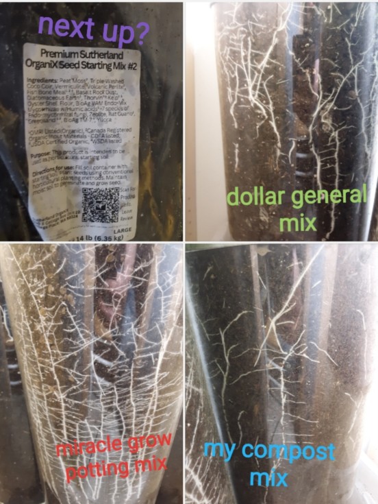 But if I did, I'd probably compare miracle grow, promix, Sutherland's mix cut 1:3 with promix, and pure Sutherland's mix. Might be interesting.