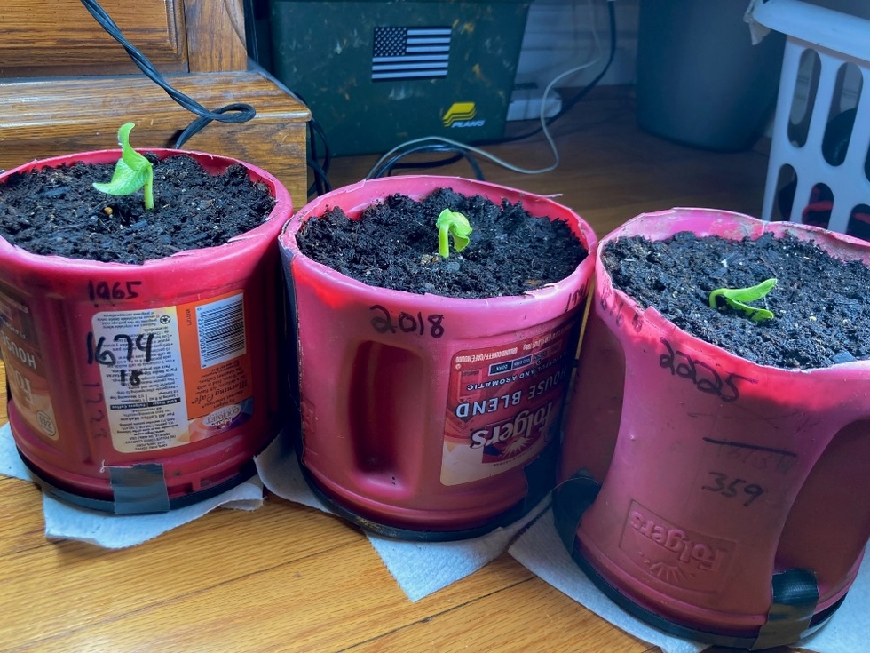 Back in the depths of a storage room are the newly germinated plants from this morning. Will have them in the patch mid to late next week.