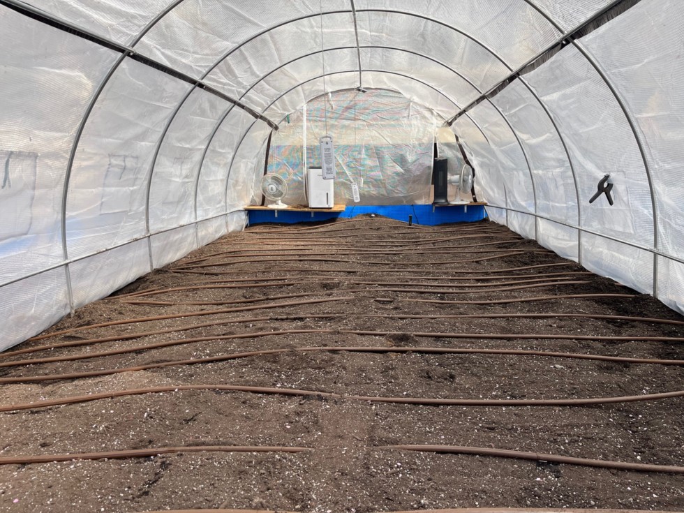 Final rototill is done, heating coils are warming soil temperature around transplant site, heater set for 78F to keep nighttime temps decent. Small 10x20 ft greenhouse warms up very fast in the morning with any amount of sunshine. Final step will be to hang grow lights over transplant area to provide extra nighttime heat and a little extra boost. Transplant day is less than a week away - all three seeds are showing their first true leaf now.
