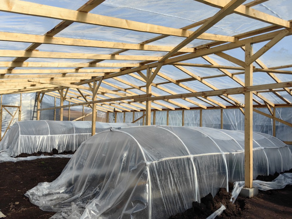 There is no snow on the greenhouse anymore, the sun has returned. There are two pumpkins growing here, 2266 and 2365.