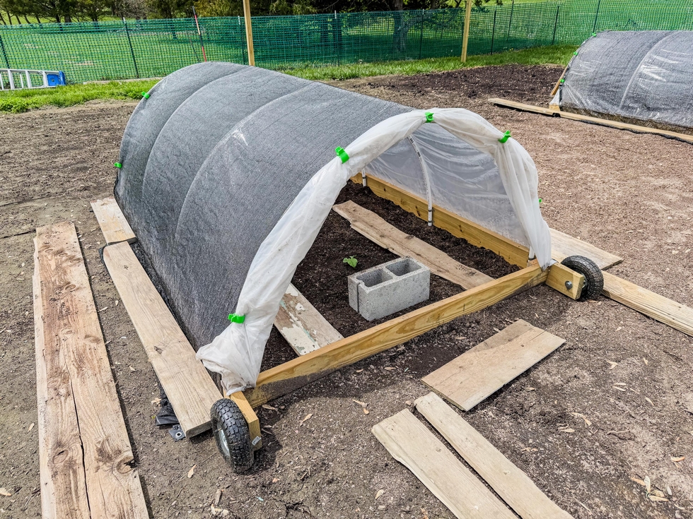 Two plants in the ground, 2006 Wolf and 2453 Sherwood. Azos and Pumpkin Power mixed in, watered in with Rootshield plus. It's been hot and sunny so I added some shade cloth as they acclimate. Even with the ends open, hoop house temps are around 90 during the day.
