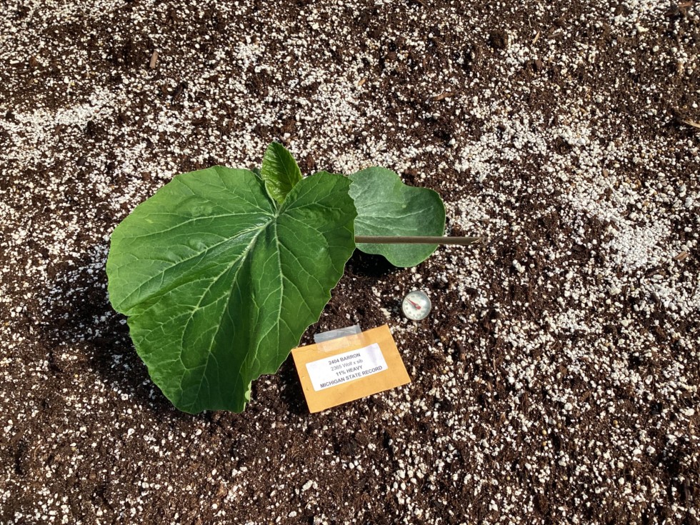 2404 Barron is the first outside and into the hoophouse, soil at 8 inches down is around 79 degrees with the soil heat cables and around 65 degrees without. The Sandercock plant will get another day or 2 under lights while we put the skin on the next hoophouse and get it more ready for a transplant. The prizewinners will also have to wait awhile longer, but they will be nice large plants at transplant when we are ready.