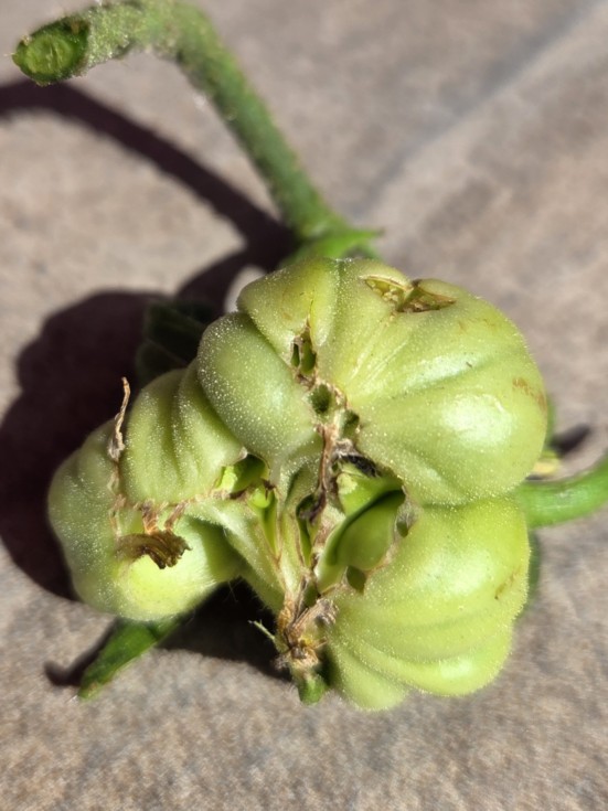 First cull of the year, maybe a quad. This is from a very early start & test seed from my wonky 9.06 ribbon fruit last season. I needed space for my competition seedlings, so this truss 1 fruit has been culled and the plant in the compost bin. I was surprised it set cuz night temps are still well below 55 degrees. That 55 degree threshold I've read about may be false. Someday I'll give my own seed stock some street cred. Needs to be earned though.
