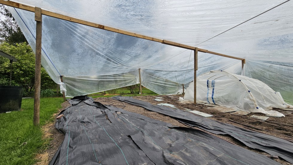 The ridge beam is 8ft high. The middle outside poles are 7 ft high and the corner posts are 5 ft tall. It's fairly easy to walk under. It was erected in 2 - 4 hr sessions. It gives a lot of protection from the elements. It raises the temperature under it significantly. It prevents large variations of water (rain) from impacting the pumpkin growth. The patch is 30' x 28' and the piece of poly is 40' x 40'. This patch grew my personal best of 1632 lbs for an "outside" plant. The largest outside pumpkin in BC is the Halliday 1728.