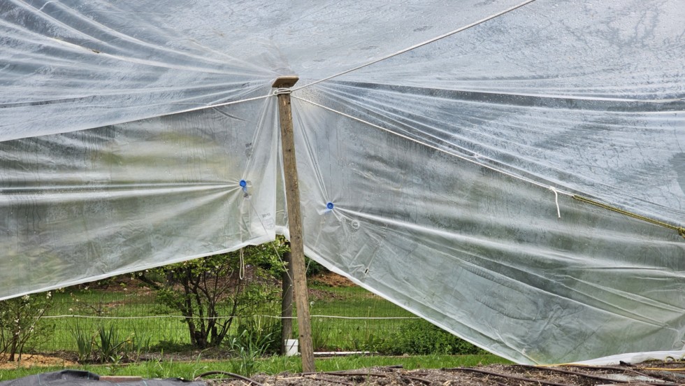 A closer pic of details of a post. A 6"x6" plate of 3/4" plywood is necessary for the top of the post to prevent a puncture of the poly. The blue thingamajigs are poly clips. These hold the best. All others I've tried slip sooner than later.