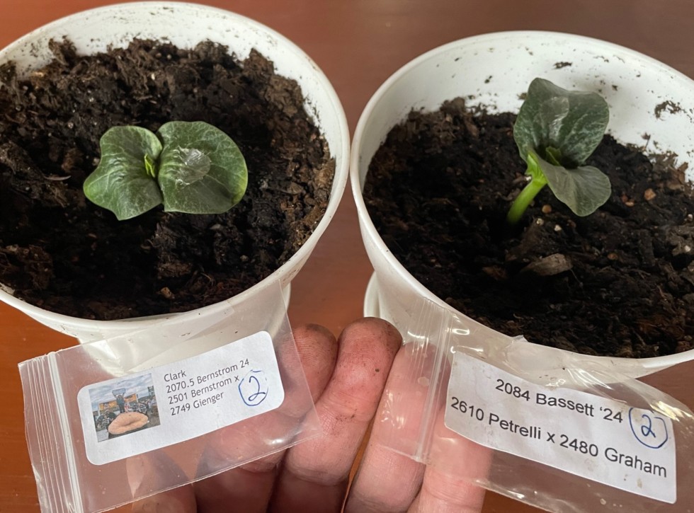 Final Team: 1st set - 2046 Montsma (2520 Schmit x 1189 Wild); 2080 Bernstrom- (2365 Wolf 2501 Bernstrom) seeds started today 1 week later - 2nd set 2070 Bernstrom (2501Bernstrom x 2749 Gienger) and 2084 Bassett ( 2610 Petrelli x 2480 Grahan) 1 week later - 3rd set 2004 Bernstrom (2749 Gienger x 2501 Bernstrom) and 2098 Bassett ( 2480 Graham x 2493 Wolf) Plant 1st set in opposite directions, 2nd set side by side 1st set and if lose any of those have the 3rd set going. The 2 vines that finally make it usually come from the 2nd or 3 sets. First set commonly freezes, kinks, gets stepped on, splits the main - they never make it.