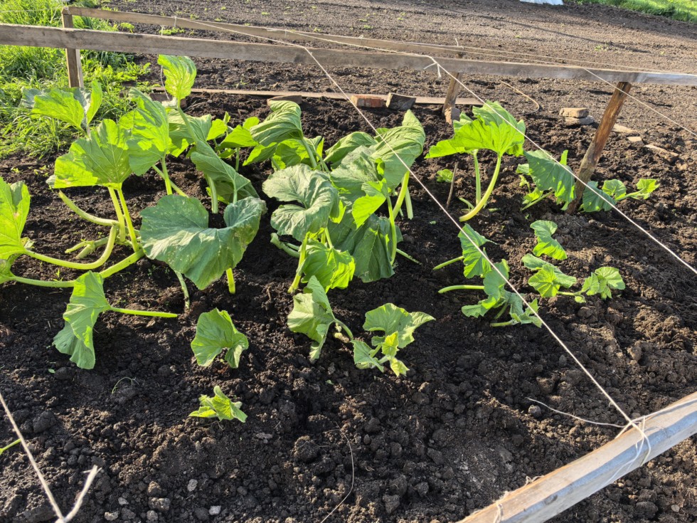 Today I removed the temporary shelter from 2344.5 Wallace as the plant has outgrown it. This pumpkin grows very fast. It was very windy today, so the leaves in the photo look nondescript. Now the plants will have to acclimatize to the open ground. In case of frost, I put up supports. The forecast for the next 10 days is favorable. The length of the main vine is 10.5 ft.