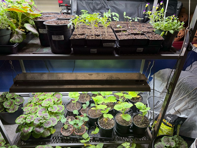 I will start this week with our grow bench as the weather the next 7 days is cold and wet. Tomorrow we have a high of 48 degrees. We have brought most plants inside. Here are giant tomatoes, sunflowers, long gourds and back up pumpkins. And maybe a flower or two.