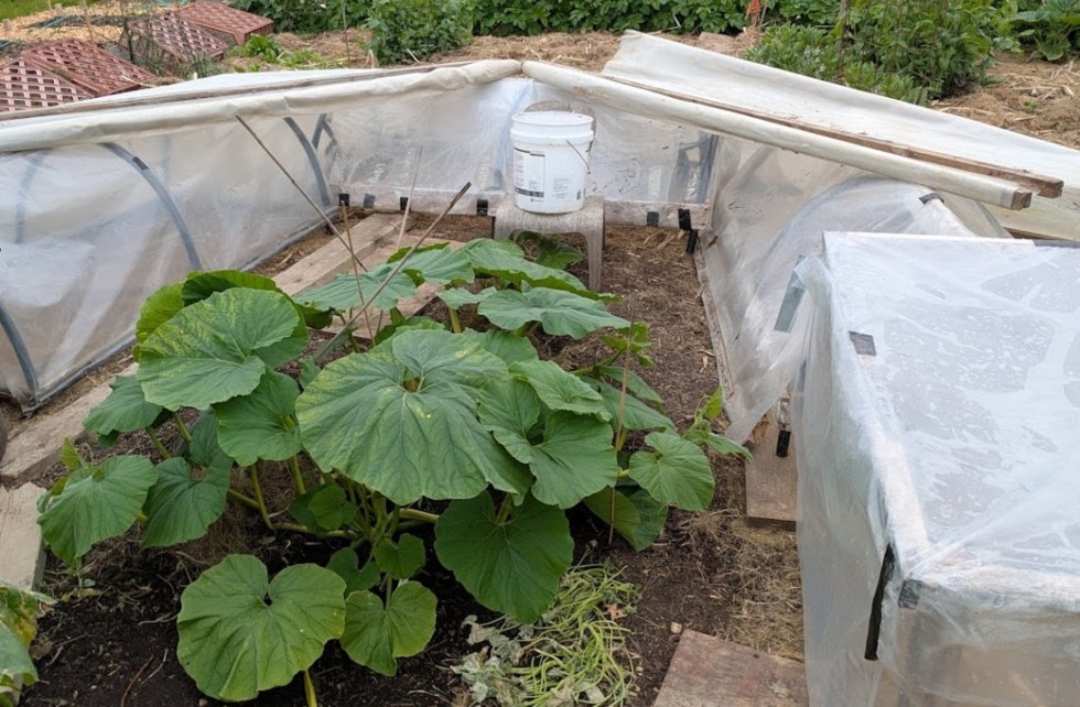 Took the hoops off yesterday as the secondaries had hit the sides and the main vine had reached the end. Unfortunately it is now cool and overcast (perfectly poor timing after weeks and weeks of nice sunny weather). This makeshift wind block will have to do for now.