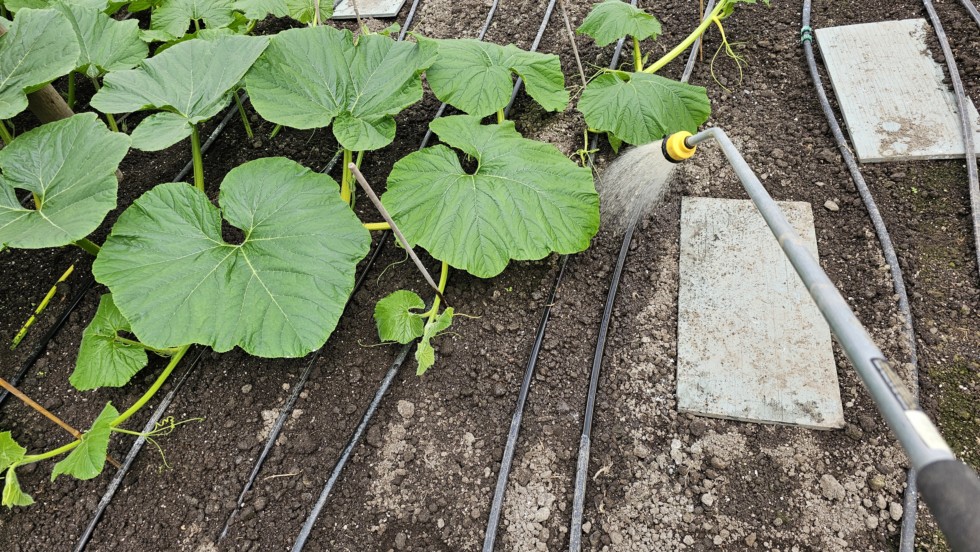 One thing I like to do when the plants are small is using a 2 gallon green watering can filled with biologicals to drench the vines after burying. Mixing and carrying the watering cans can be a chore so I have plumbed the whole greenhouse to be able to drench vines with a spray wand. It works amazingly well, fast and with no need to carry heavy watering cans.