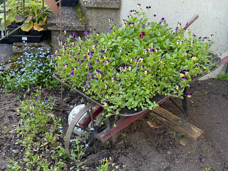 For the flower lovers, here is our antique wheelbarrow filled with johnny jump ups and pansies (yet to bloom). Happy start to summer!
