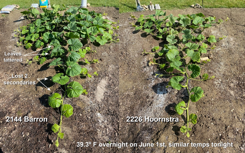 I've been away the last 3 weekends and hadn't gotten my wind fencing up. I paid a price for that. I lost 2 secondaries, many roots and many leaves on the 2144, a bad hit to what had been a strong plant. The 2226 Hoornstra was less beaten up. Our terrible spring continues, 39 degrees last night and the same tonight. Fall starts around August 15th here and our summer is shrinking fast.