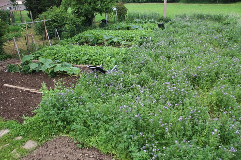 Jungle...ahm...patch today ;) Now the time has come that I need to remove the cover crop which is doing pretty well in between the AG plants (oil radish and some rye and some weeds), need to get rid of it within the next two days. Then, as the main vines grow, I need to remove the phacelia flowers over the course of the next two weeks.